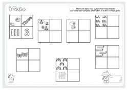 Teach your child that there are several ways to write down quantities. To make things fun, decide on fun names before you start - space wanderers, spies, or secret agents. Ask: "You saw five space pirates, but you can't tell me about it using words. How can you tell me their quantity without words?" Help your child remember different ways of information transfer. Showing it on your fingers, using other subjects, or by writing it down on paper. When we write down the quantity of something on paper, we also use different methods. You can draw, write the number "5", or write the word "five". It is also possible to designate the quantity by tally marks. Draw four tally marks in a row, and the fifth crosses through the first four. One more way to count five is to make four points and use a line to unite them in a square. If we wrote down two fives (or a total of ten), what amount of objects would we designate?